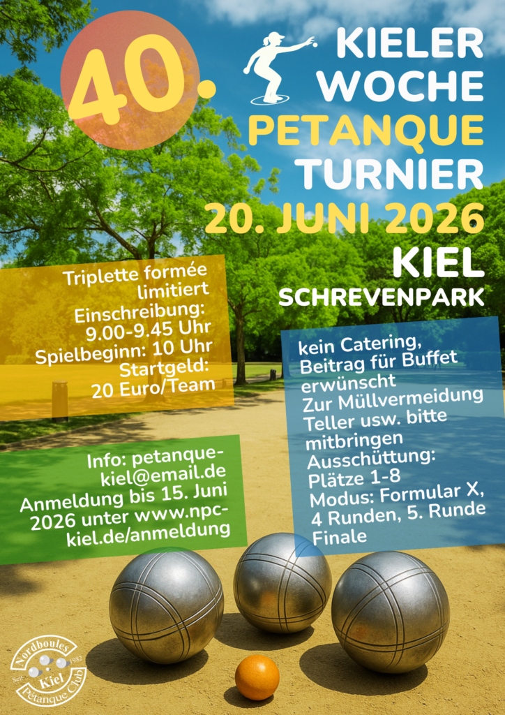 Am 7.September 2025 haben wir auf unserer ‚Hausbahn‘ im Schrevenpark den 43. Vereinsgeburtstag des Nordboules Petanque Club (NPC) Kiel gefeiert. Bei bestem Wetter starteten wir um 11 Uhr mit dem 1. Supermêlée der neuen Saison 2025/26. 29 Teilnehmer*innen lieferten sich spannende 3 Runden mit unterschiedlichen (ausgelosten) Partner*innen. Am Ende setzen sich Pia mit 3 Siegen und dem besten Punkteverhältnis durch, gefolgt von Daniel und Bianca mit ebenfalls drei Siegen. Glückwunsch an die Gewinner*innen!. Für weitere Ergebnisse siehe Tabelle weiter unten.