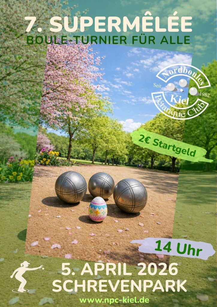 Die Supermêlée – Turniere des NPC Kiel finden monatlich (normalerweise) an jedem ersten Sonntag im Monat statt. Das nächste Supermêlée aber aufgrund von anderen Pétanque-Turnieren an einem anderen Tag, das genaue Datum wird zeitnah hier bekanntgegeben! Alle am Boule- bzw. Pétanquesport- Interessierten sind herzlich eingeladen, teilzunehmen!