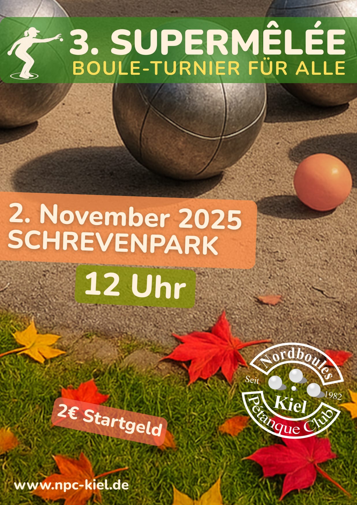 Der Nordboules Petanque Club Kiel (NPC Kiel) veranstaltete am Sonntag den 2. November 2025 im Kieler Schrevenpark das dritte Supermêlée Petanque Turnier dieser Saison. 32 Teilnehmer*innen in ausgelosten Teams lieferten sich drei Runden lang spannende Spiele mit unterschiedlichen Partner*innen. Petra holte sich mit 3 Siegen den Turniersieg, gefolgt von Andreas und Nils.